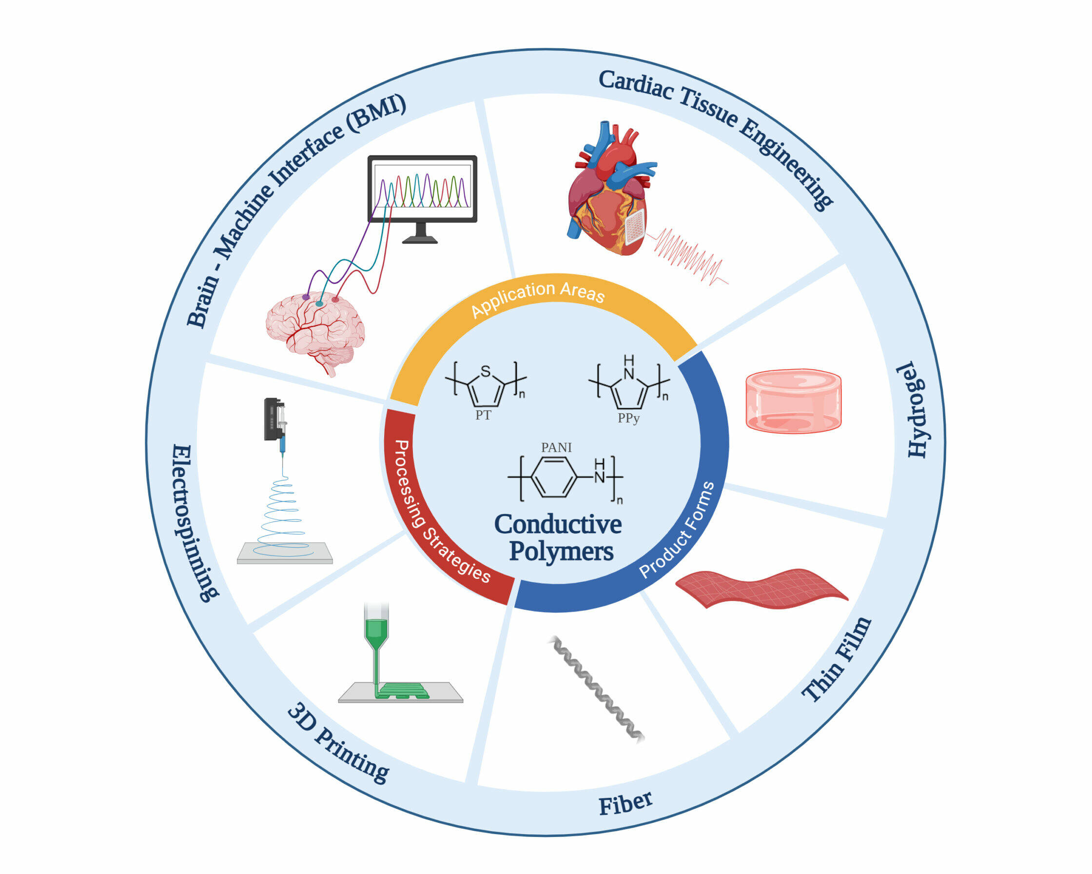 We develop advanced electrically conductive platforms based on various conjugated polymers with customized architectures, achieved through electrospinning and 3D printing. Over the last decade, our attention has focused on the use of tailor-designed polythiophene derivatives for the development of advanced biomaterials, finding applications in various forefront fields, including brain-machine interfaces (BMIs) and cardiac patch systems.