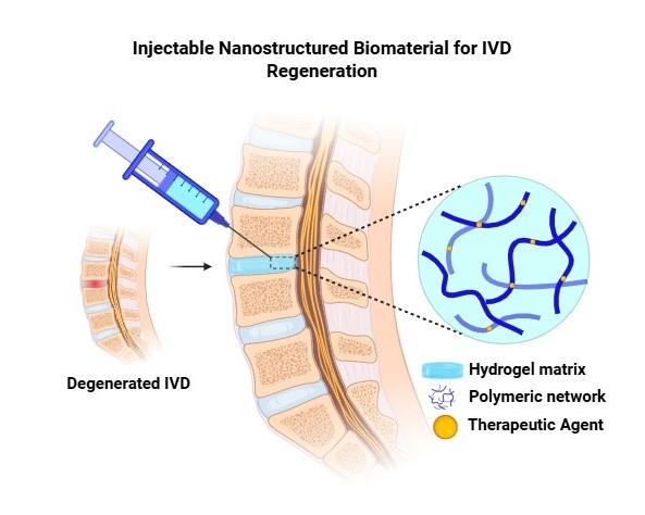 We design injectable biomaterials that integrate nanostructured architecture, light responsiveness, and biocompatibility to enable minimally invasive, tissue-sparing therapies. Using electrospinning, laser-assisted fabrication, and nanocomposite hydrogel engineering, we develop adaptive systems with antibacterial, self-healing, and controlled drug-release capabilities. One of our key approaches involves tailoring nanofiber scaffolds into injectable composites for the regeneration of intervertebral discs. These multifunctional platforms reflect our commitment to advancing clinically relevant biomaterials for next-generation regenerative medicine and tissue engineering.